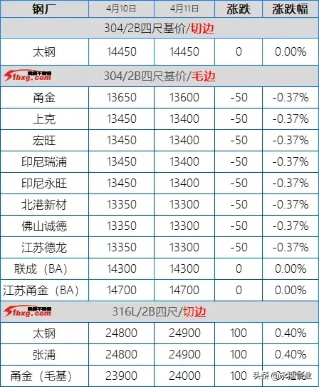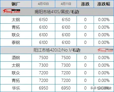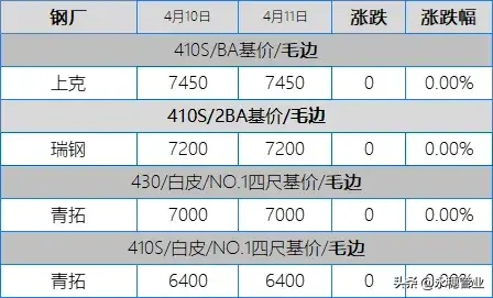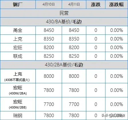 目前市场主流报价:410S热轧黑皮在6100-6150元/吨,个别在6200元/吨左右;430热轧黑皮在6700-6800元/吨;太钢/酒钢430/2B(毛)在8000-8100元/吨;联众430/2BA(毛)在7800-7900元/吨;宏旺430/2BA(毛)在7800-7850元/吨;甬金430/BA(毛)在8450元/吨左右;上克430/BA(毛)在8350元/吨左右;宏旺430/BA(毛)在8200-8250元/吨;瑞钢430/2BA(毛)在7800元/吨左右;联成430/BA(毛)在8250元/吨左右。