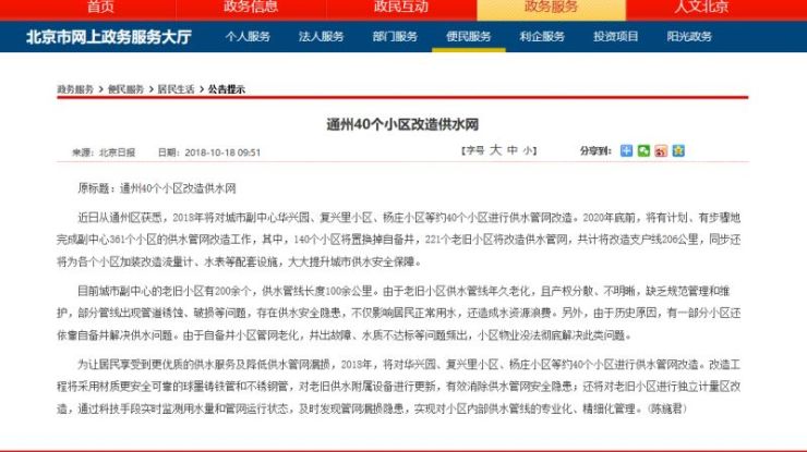 2020年底前,将有计划、有步骤地完成副中心361个小区的供水管网改造工作,其中,140个小区将置换掉自备井,221个老旧小区将改造供水管网,共计将改造支户线206公里,同步还将为各个小区加装改造流量计、水表等配套设施,大大提升城市供水安全保障。